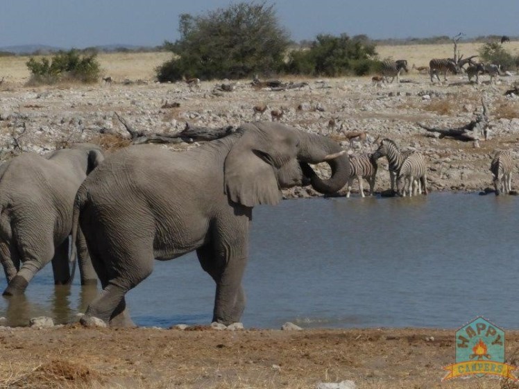 We arrived at Okaukuejo around mid-day and luckily we could check in earlier due to our campsite already been vacated by the previous campers. I was quite impressed with the camping ground as the stands are quite large and you’ve got proper space between your neighbor’s camp and your own. Our campsite was a short walk away from the ablutions and a quick 5-minute walk to get to the waterhole. This is however when we first saw the huge overlanding buses as well and we were quite apprehensive about standing close to these groups but more on than later. We set-up camp and then we went to find the well-known Okaukuejo waterhole.